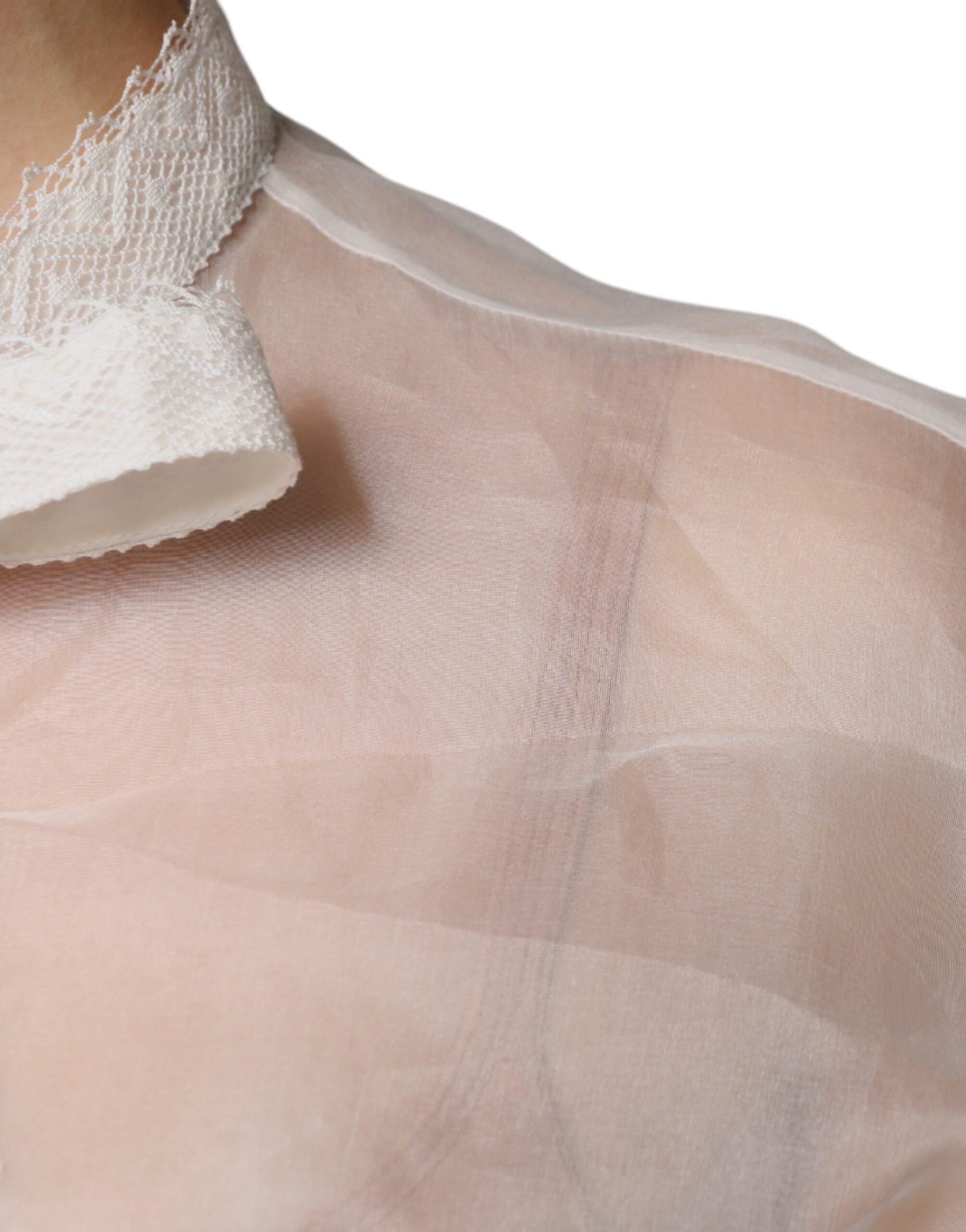 Gorgeous brand new with tags, 100% Authentic Dolce & Gabbana white blouse is complemented by an ascot collar. The fitted model with long sleeves is made of fine silk jersey.