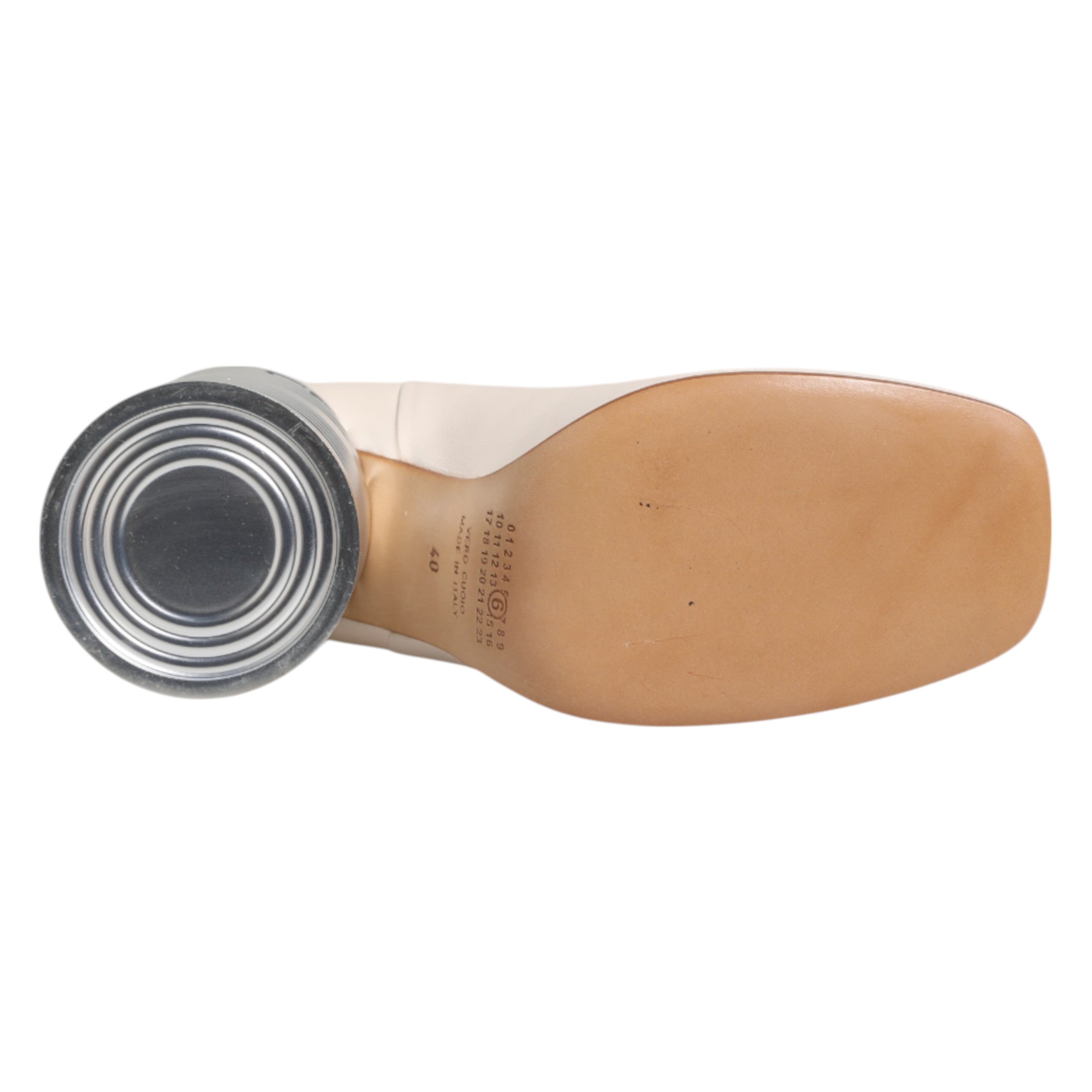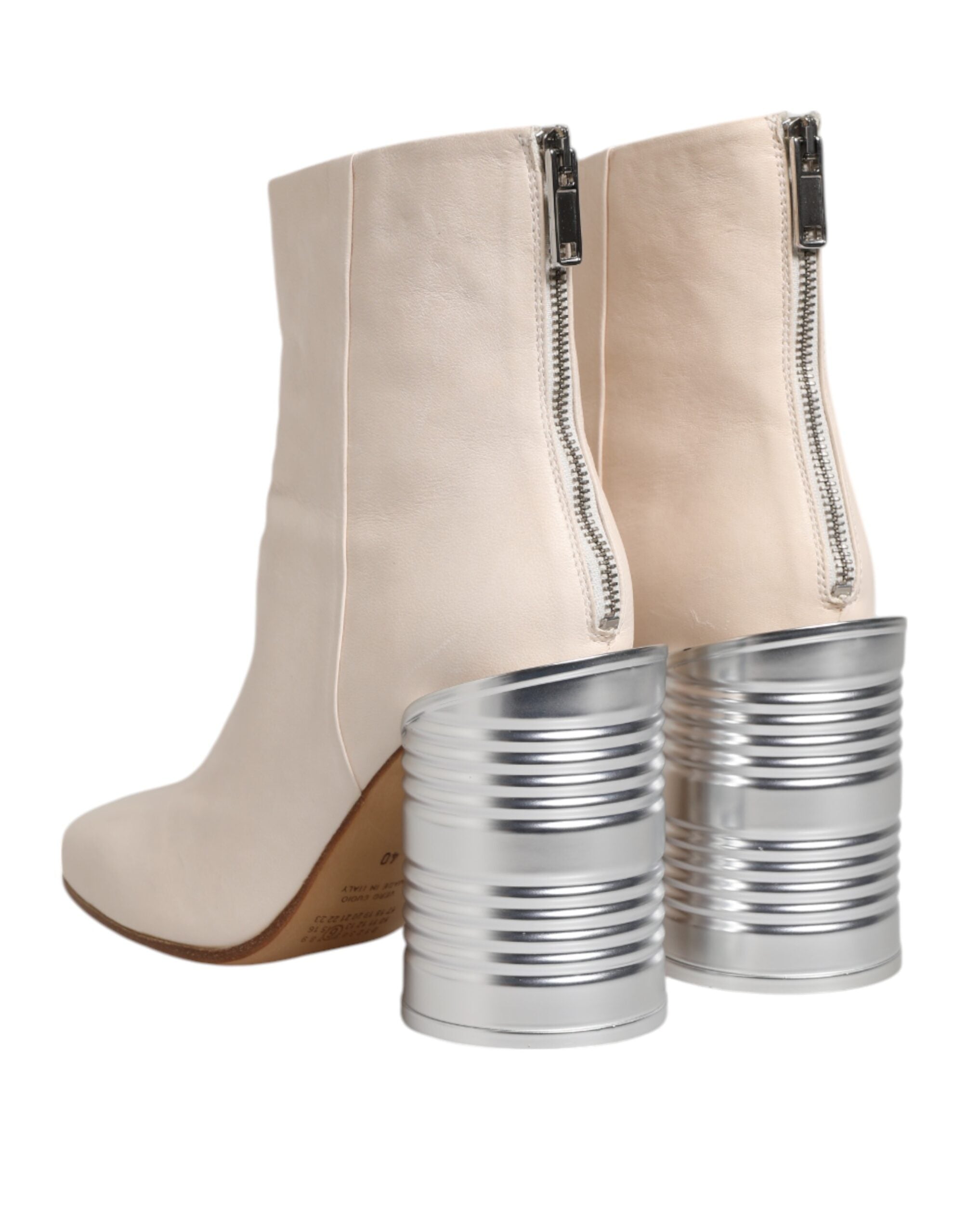 Gorgeous brand new, 100% Authentic MM6 MAISON MARGIELA ankle boots buffed leather in white. Zip closure at heel. Textured metal cylindrical heel. Leather sole in tan. Silver-tone hardware.